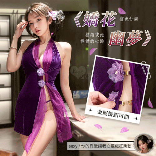 情趣睡衣!迷情幻紫絲絨拚紗斜開襟綁脖露背連身裙兩件組