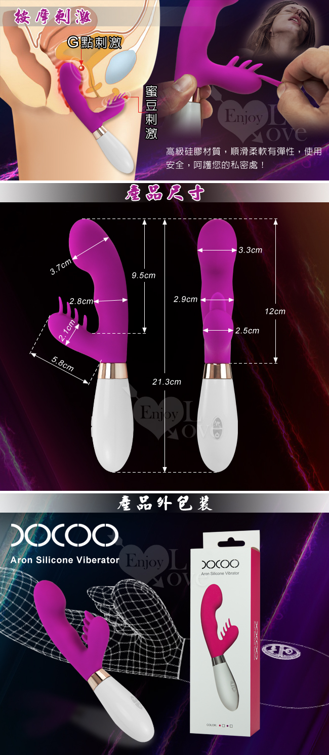 外觀漂亮、時尚、動感、大方、靜音、符合人體工學設計,高強度刺激陰道內部,更容易找到g點加強刺激。 棒體採用醫療級硅膠,手柄採用abs環保材質,安全無毒,整體觸感舒適。 內置優良馬達提供強大動力,12種不同的震動強度可分別,針對前戲、中段、高潮而任意調節。 矽膠手感極好,一觸摸到她就能讓您心潮澎湃,迫不及待地去領略她的風采。 溫馨浪漫又熱烈奔放,快樂感受無法言喻,只有親自體驗了才能感知他的無限魅力。 獨特按摩頂端帶來極致狂野,隨時隨地近乎無聲的激情享樂。 可以同時刺激陰道和外'陰蒂,比傳統按摩棒刺激性更強大。 ★適用4號電池2顆,因為是12段變頻設計,所以敬請使用金頂或國際等高勁量電池來供電,以利運作。 ★詳細樣式及說明如圖片所示。