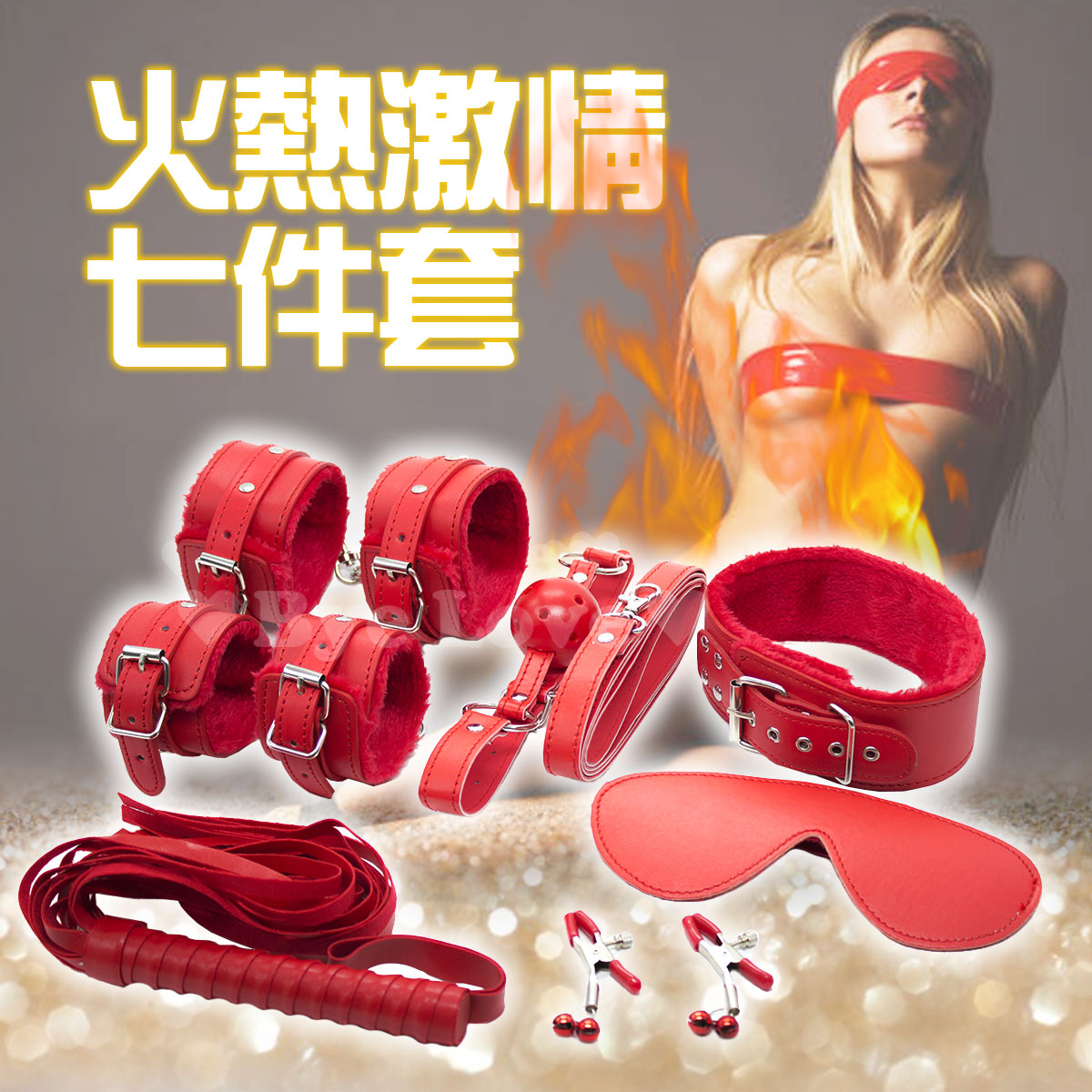 | SM 火熱激情7件套(眼罩+口塞+鞭子+手銬+腳銬+脖圍+棉繩) 紅色
