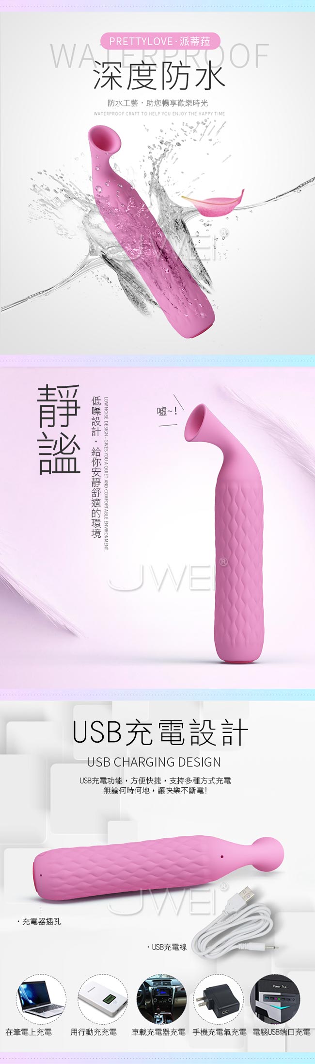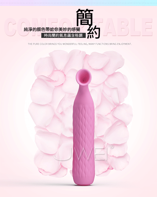 輕靈美感與純靜顏色合而為一強大的功能告訴你它不是一個花瓶!強力時尚吸吮按摩棒擁有12段變頻模式等您來切換,彷彿愛人的蜜唇般充滿魔力讓您欲罷不能!!小巧便攜的造型方便外出攜帶,小巧的吸吮按摩器功能強大,讓您出門在外也能滿足自己的慾望。符合人體工程學設計柔軟親膚材質吸頭,觸感舒適可配合強勁吸吮進行按摩,棒身優雅溫花紋美觀同時增加摩擦力方便手中使用!底部開關設計可調節頻率避免誤觸切換頻率。採用防水設計,方便清洗讓您在浴室裡也能使用享魚水之歡唷~靜謐低噪設計讓您在安靜環境內盡享愛的私密空間!USB充電續航方便,支持多種方式充電無論何時何地讓快樂不斷電!