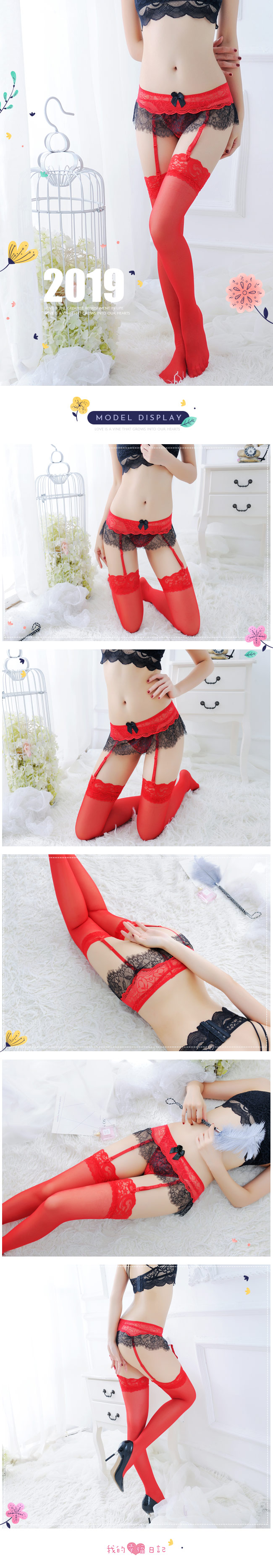楚楚可人.睫毛蕾絲撞色吊襪帶三件組(紅)