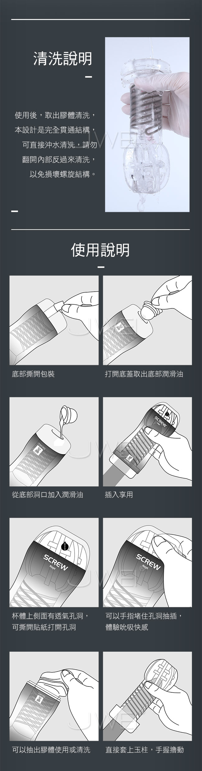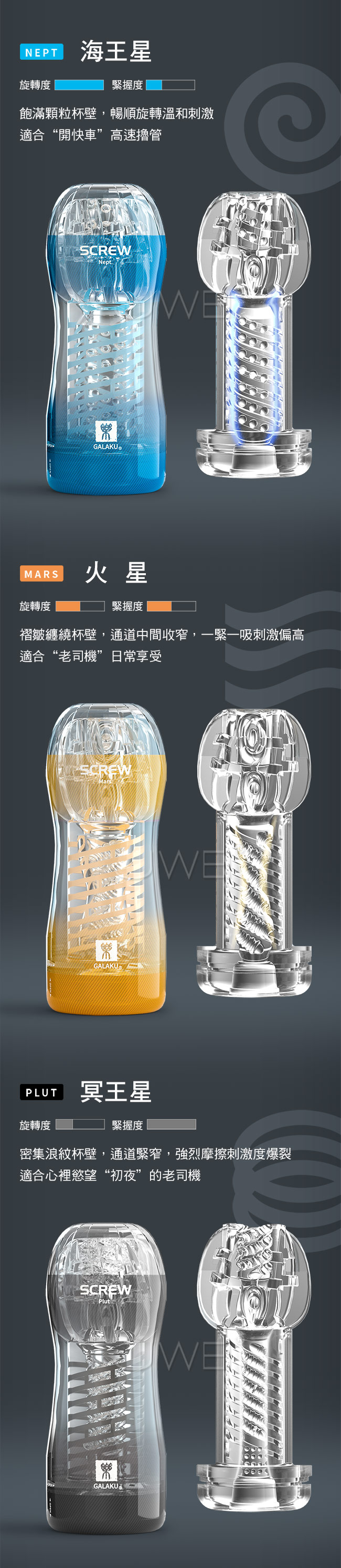 SCREW旋吸飛機杯皆為螺旋結構設計帶來旋轉快感,採用安全柔軟軟膠強韌抗拉耐用使用上衛生無毒。此三款分別擁有不同鬆緊程度來讓您挑選,海王星飛機杯飽滿顆粒杯壁,暢順旋轉溫和刺激適合“開快車”高速擼管。火星飛機杯褶皺纏繞杯壁,通道中間收窄,一緊一吸刺激偏高適合“老司機”日常享受。冥王星飛機杯密集浪紋杯壁,通道緊窄,強烈摩擦刺激度爆裂適合心裡慾望“初夜”的老司機。且採完全貫通結構,可直接沖水清洗,無需翻開內部反過來清洗,以免損壞螺旋結構喔~