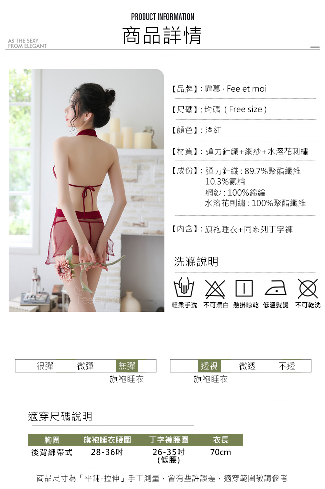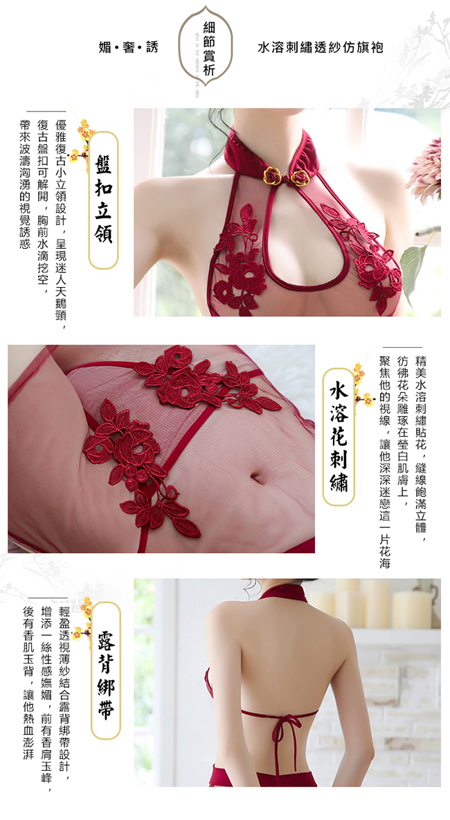 ►您現在的位置:首頁>仿旗袍睡衣!盤扣立領水滴挖空刺繡貼花裙側開衩兩件組﹝酒紅﹞