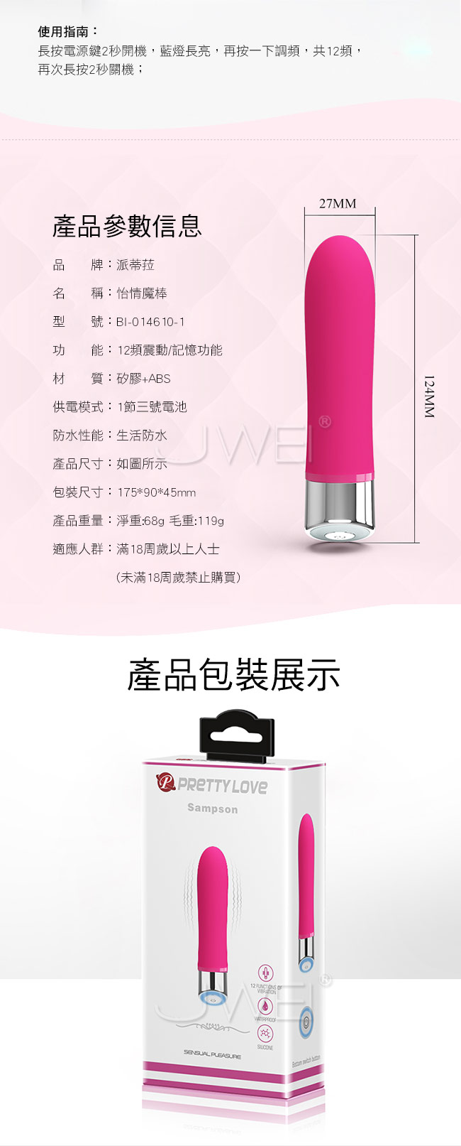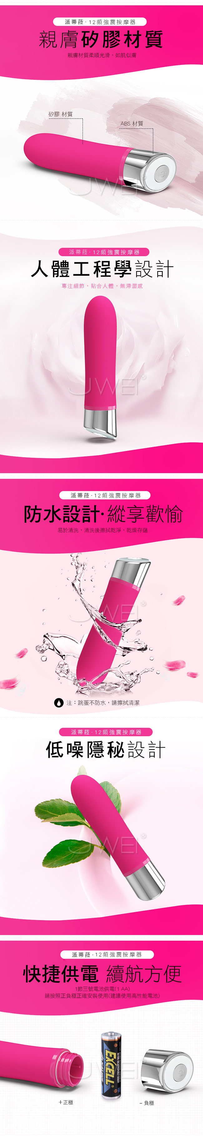 ■特色:12段變頻震動、記憶功能、生活防水、低噪設計