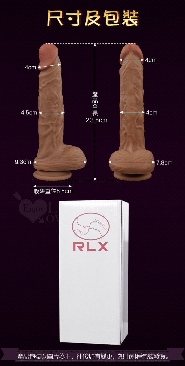 RLX系列極緻雙層液態硅膠逼真按摩棒,以真人老二倒模打造,細膩的完整重現真人老二的肌膚、逼真的經絡跟逼真的陰囊都猶如真實的陰莖,採用雙層液態矽膠,是女性接受度最高的硬度,底部還設計有吸盤底座,可吸於牆上、床上,任何的光滑表面,多種玩法任你玩,還可以開水加溫,讓體溫如真人一般,讓你性愛過程更有樂趣喔~