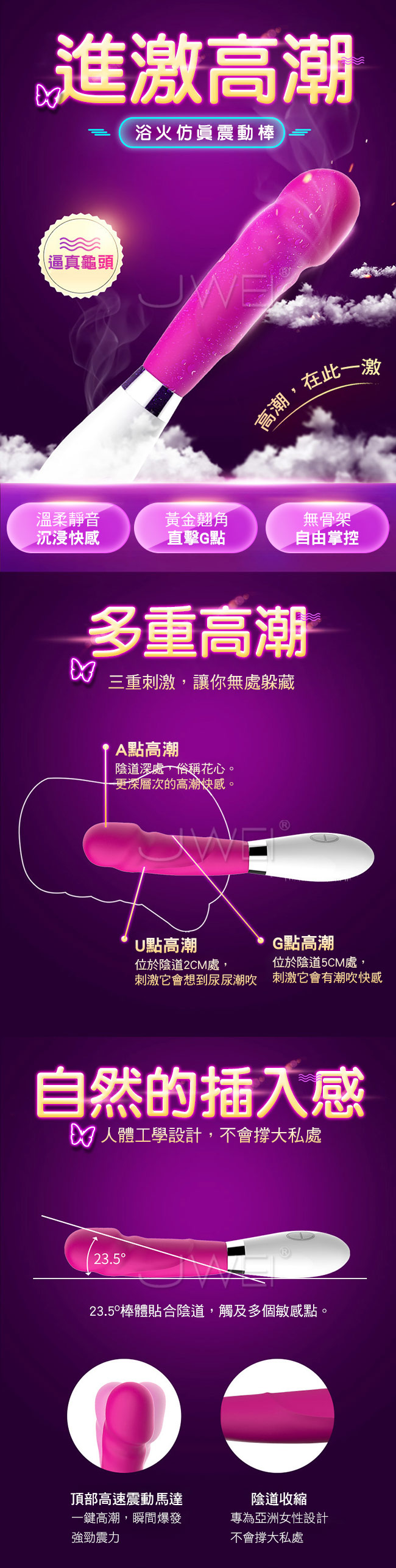 浴火仿真女用震動棒讓您享受真正多重高潮,自然的插入感人體工學設計,不會撐大私處23.5度角設計棒體貼合陰道,觸及多個敏感點。擁有10段變頻高潮迭起,快樂不斷,愛不釋手~~採用貼心靜音防水設計讓您不管在室內、室外,自在使用釋放野性。