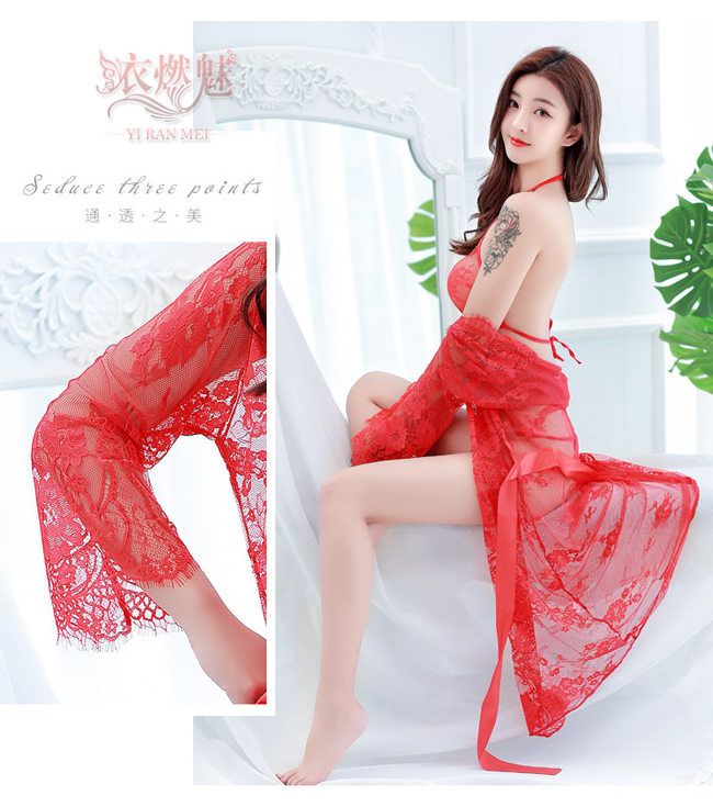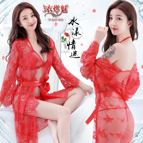 | 《YIRAN MEI》水漾情迷!三點式輕透裸肌細膩蕾絲睡袍組﹝紅﹞