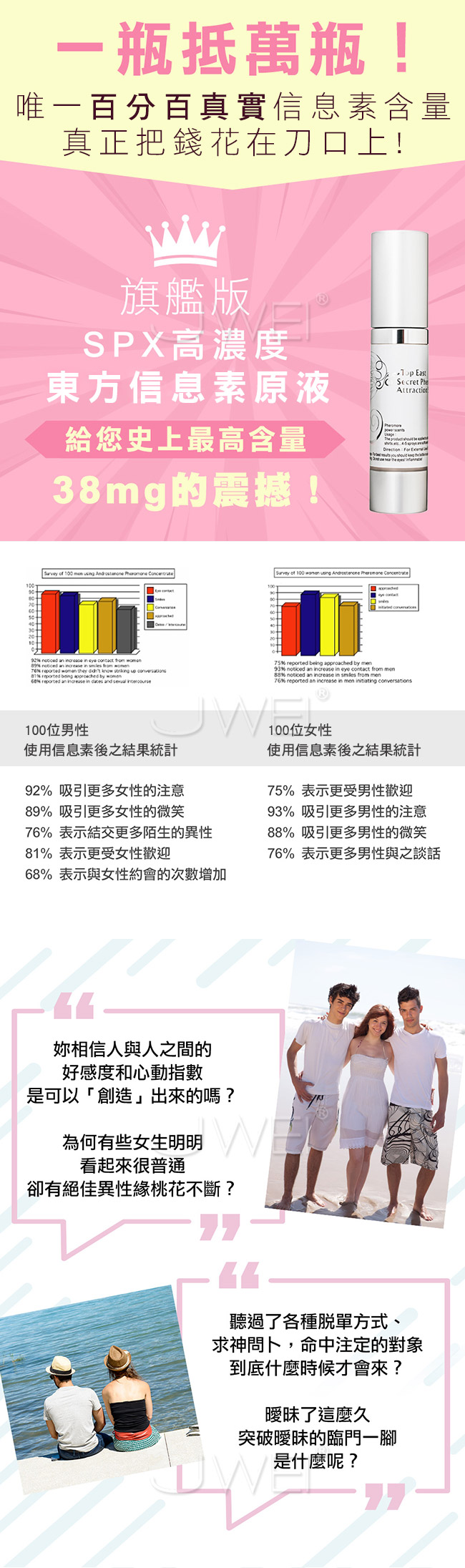 SPX旗艦版東方信息素原液給你使上最高含量的震憾,揭開信息素吸引愛情的秘密!!你相信人與人之間的好感度和心動指數是可以創造出來的嗎??希望喜歡的他能主動一點,最好是能快點撲倒你嗎?人類信息素可在對方無法察覺的情況下,增加異性吸引力,舒緩使用者的負面情緒壓力,提升正面情緒增加自信。此款SPX旗艦版-W女性專用讓您瞬間爆發愛情吸引力,成為超強發電機的秘密!