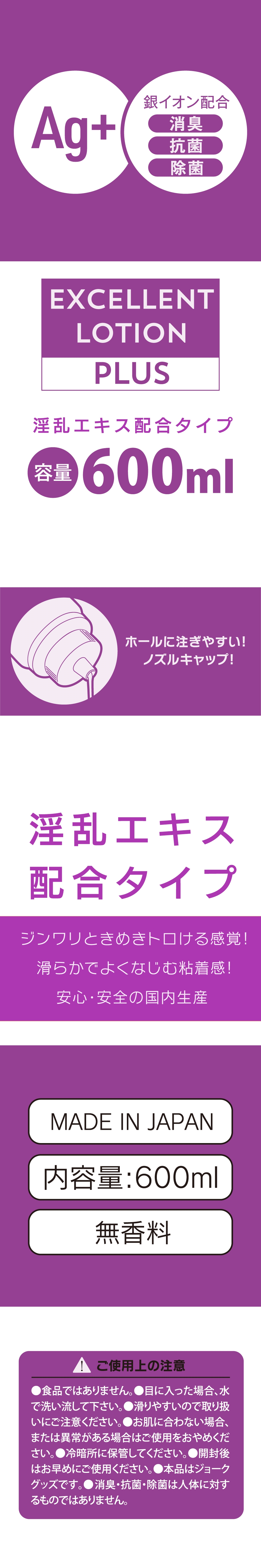 Ag+ Excellent Lotion全新升級。搭配銀離子可消臭抗菌除菌,能更安全衛生地使用 (※除臭、抗菌、殺菌部分對人體沒有作用)。助性萃取物款,慢慢讓您心動溶化的感覺!搭配瑪卡萃取物,生薑萃取物。使用尖嘴瓶蓋,易於注入入口較窄的自慰套。超大容量600ml。安心安全的日本國內生產。