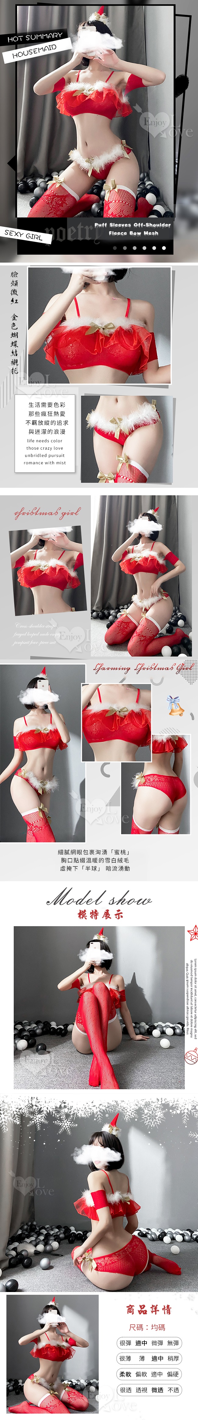 | 魅力聖誕派對!蓬蓬袖一字肩絨毛蝴蝶結細膩網眼蜜桃臀四件式套裝