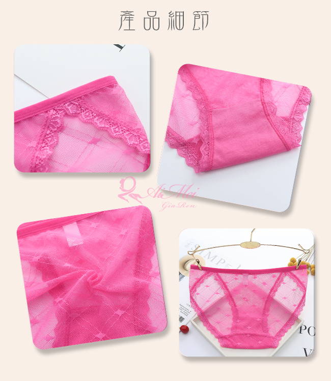 首頁>愛戀滋味!菱格紋網紗蕾絲滾邊三角褲﹝玫紅﹞