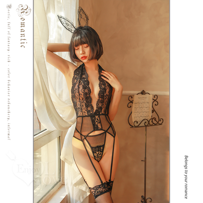 | 《 Enjoy Love 》情趣吊襪帶!繞脖V領透視美背後排釦四件式套裝 - 含絲襪