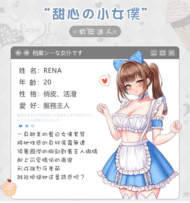 女僕角色扮演服!清新藍白荷葉花邊開衩裙襬蝴蝶結點綴七件式套裝