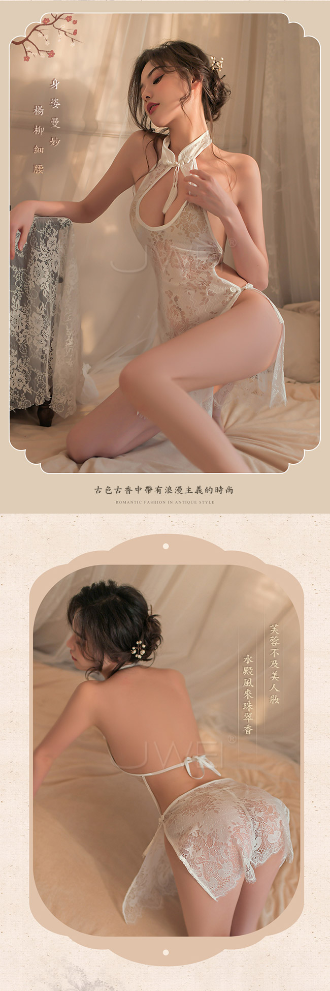 胸前水滴鏤空 透出迷人事業線 如水的玉背楚楚動人 僅留幾根繫帶輕束 玲瓏的身姿曲線一覽無遺 讓人不禁想一解為快 開啟這一場絕妙之夜