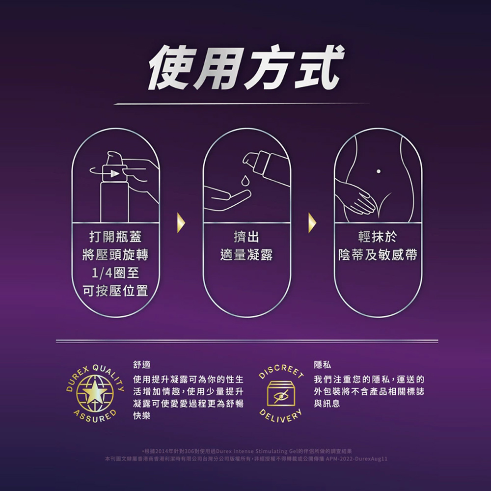 杜蕾斯女性情趣提升凝露專為提高女性私密處感官刺激所研發,獨特配方可引起刺激、溫熱和冰涼得快感,同時增加私密處的敏感度,只需再前戲時擠出少許塗抹於陰部區域,即可帶來感官的極致享受。