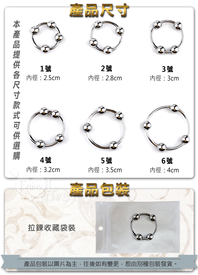 本系列產品共有6款,各個大小規格不一,從環內直徑2.5~4公分的都有,敬請參閱選購屬於自己適合的尺寸。