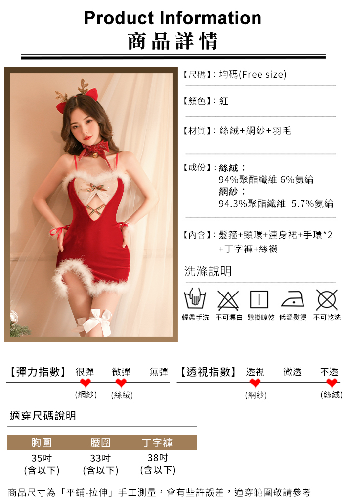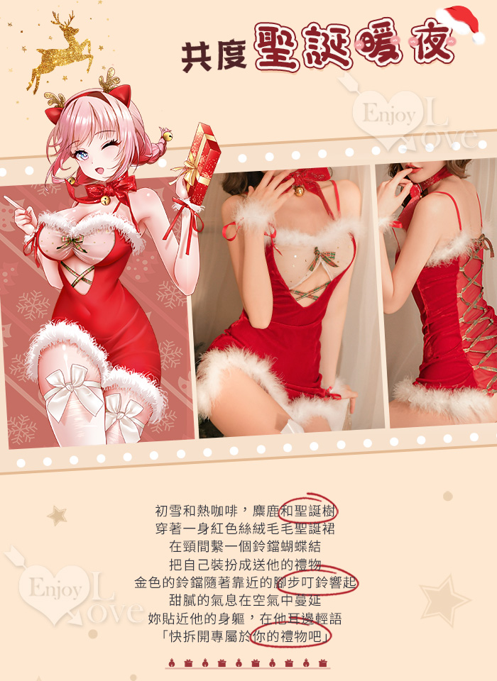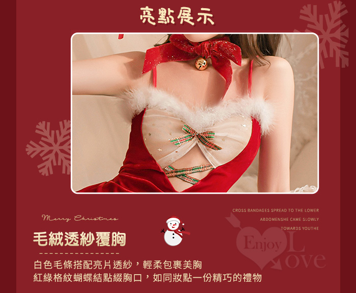 魅力狂歡派對!蝴蝶結鈴鐺毛毛透紗絲絨拼接後交叉繫帶六件式套裝 聖誕