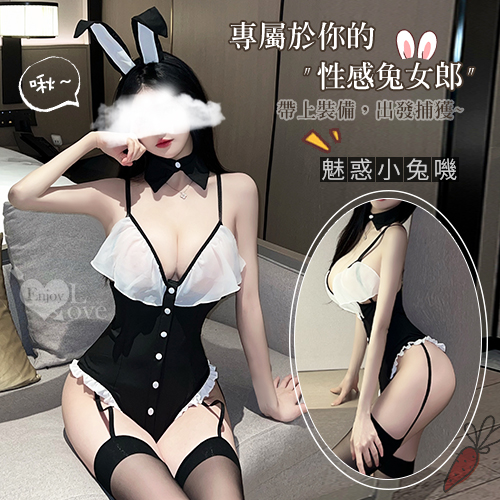 | 兔女郎角色扮演服!可調細肩透視雪乳毛邊開襠連身衣含網襪五件式套裝