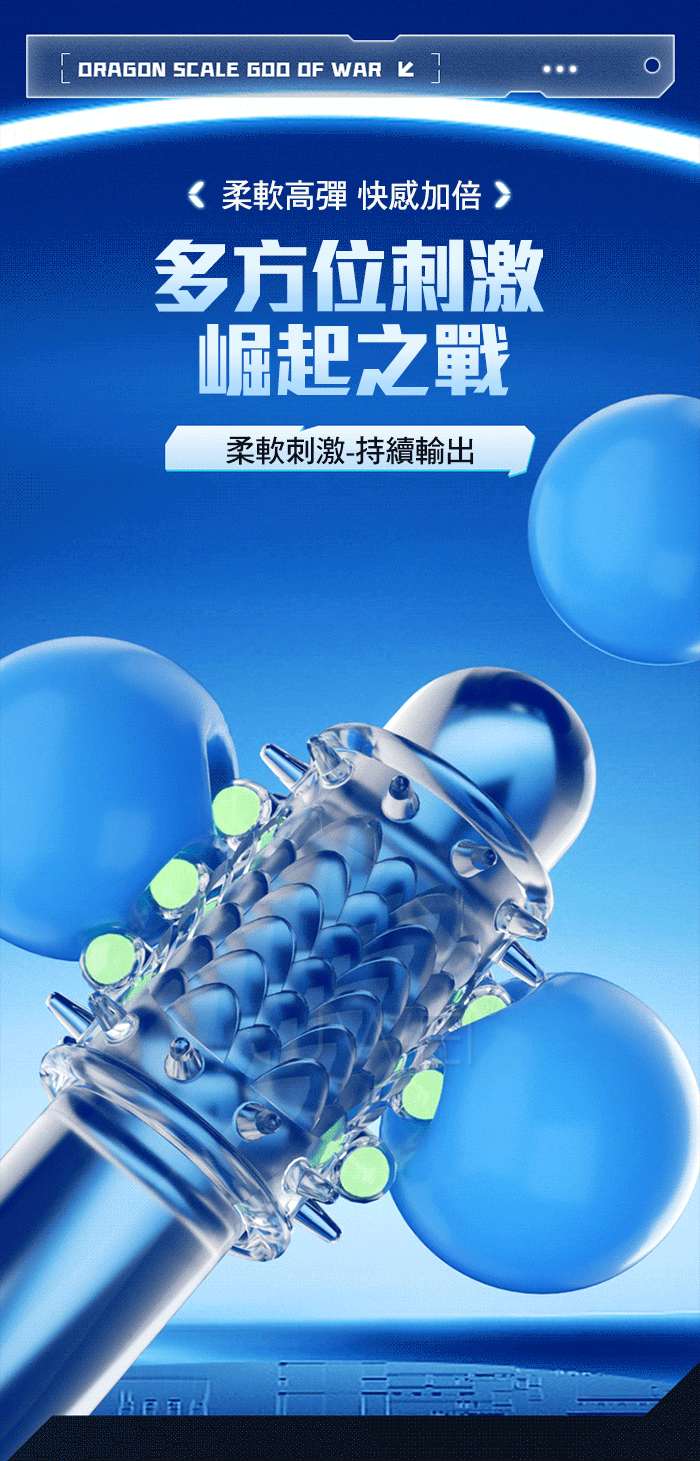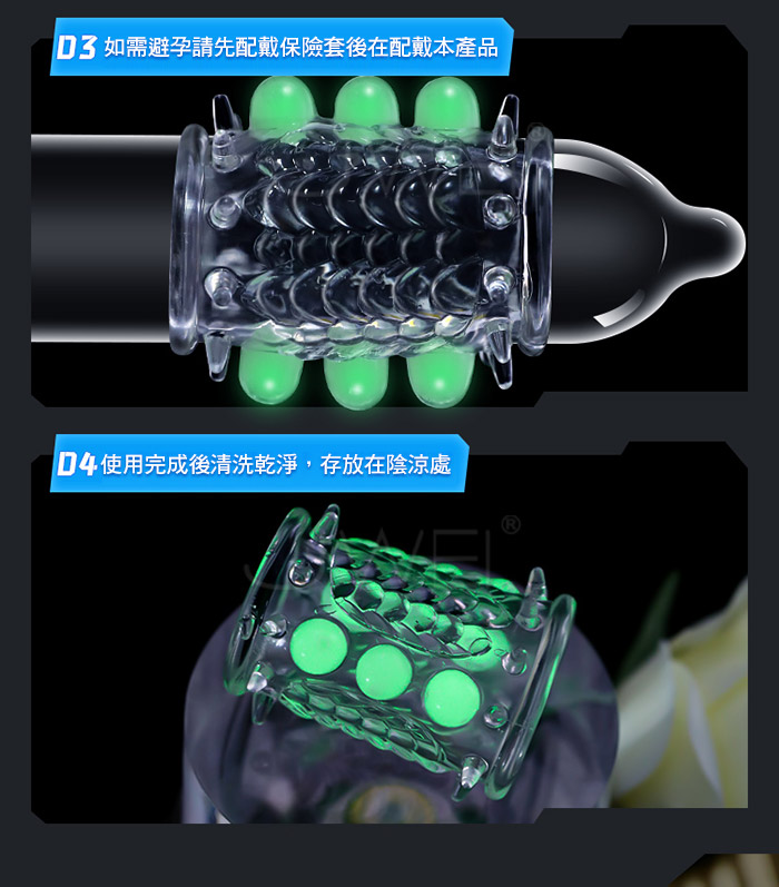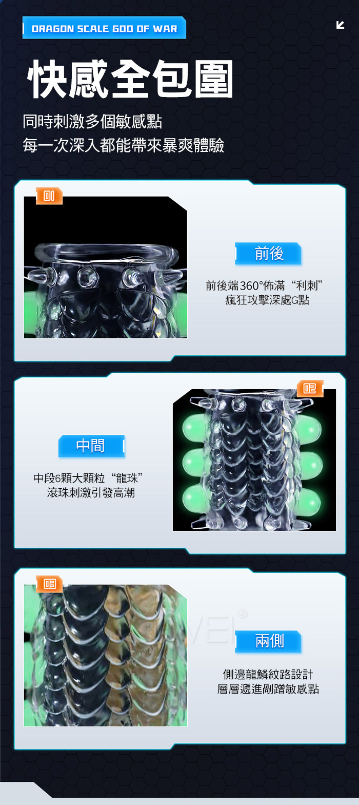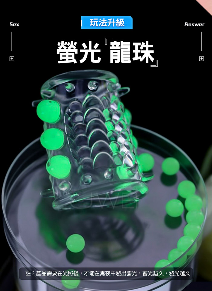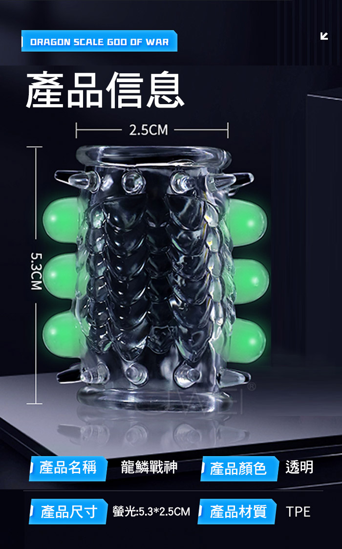 龍鱗戰神螢光套在黑夜中淡淡發光,淡淡螢光,夜光燃愛,為愛在夜間點燃,將 龍鱗戰神螢光套對著光源半分鐘以上,即可在黑暗中發出淡淡螢光。蓄光越久, 發光越久,夜光套採用安全天然乳膠材質舒滑暢。