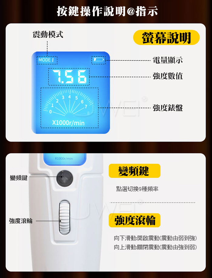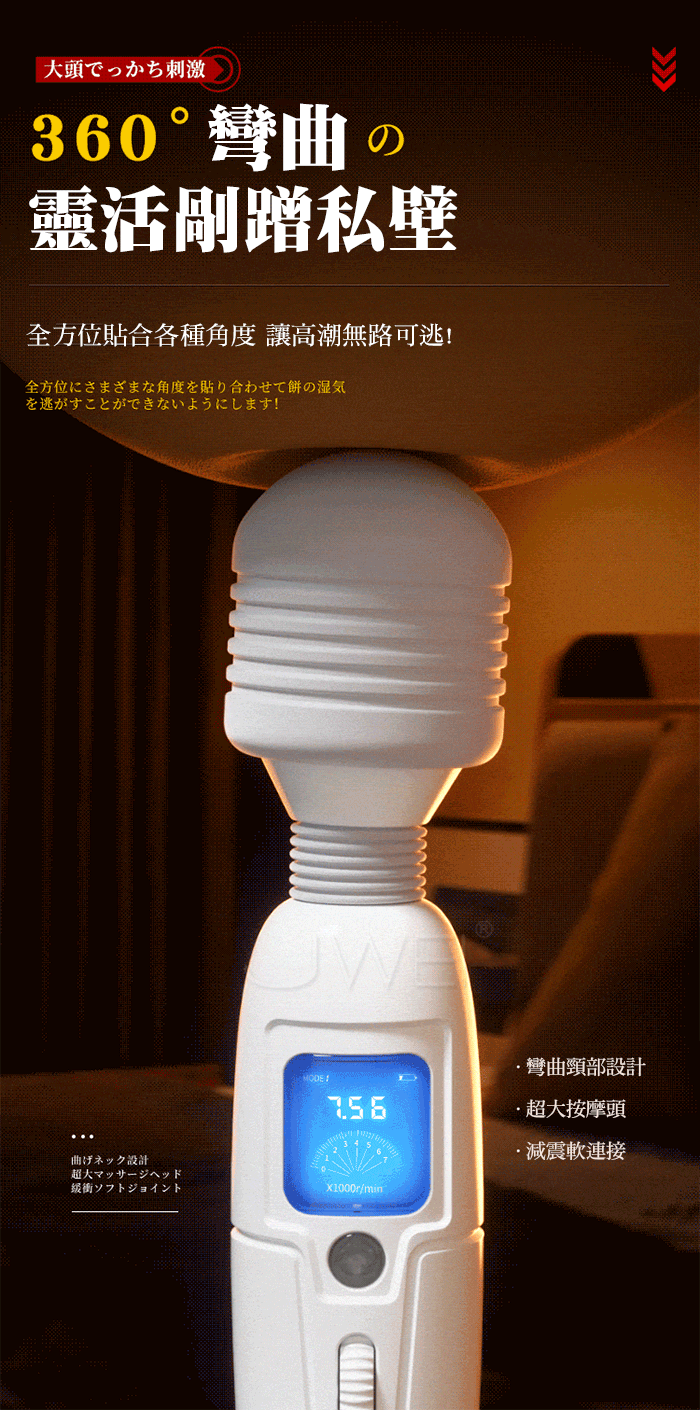日本片場熱賣款,前戲調情の高潮利器,9頻8速強震,72種高潮玩法,深入刺激 欲罷不能;超大直徑4.5cm大頭強震覆蓋,激發蜜豆高潮;龍骨彈簧設計,360 度隨意彎曲,全方位貼合各種角度,讓高潮無路可逃;液晶顯示,一目了然可視 化,看得見的高潮;無段變速,閉眼滾輪滑控,靈活一鍵直達,解鎖全身敏感地 帶,失控體驗新升級!