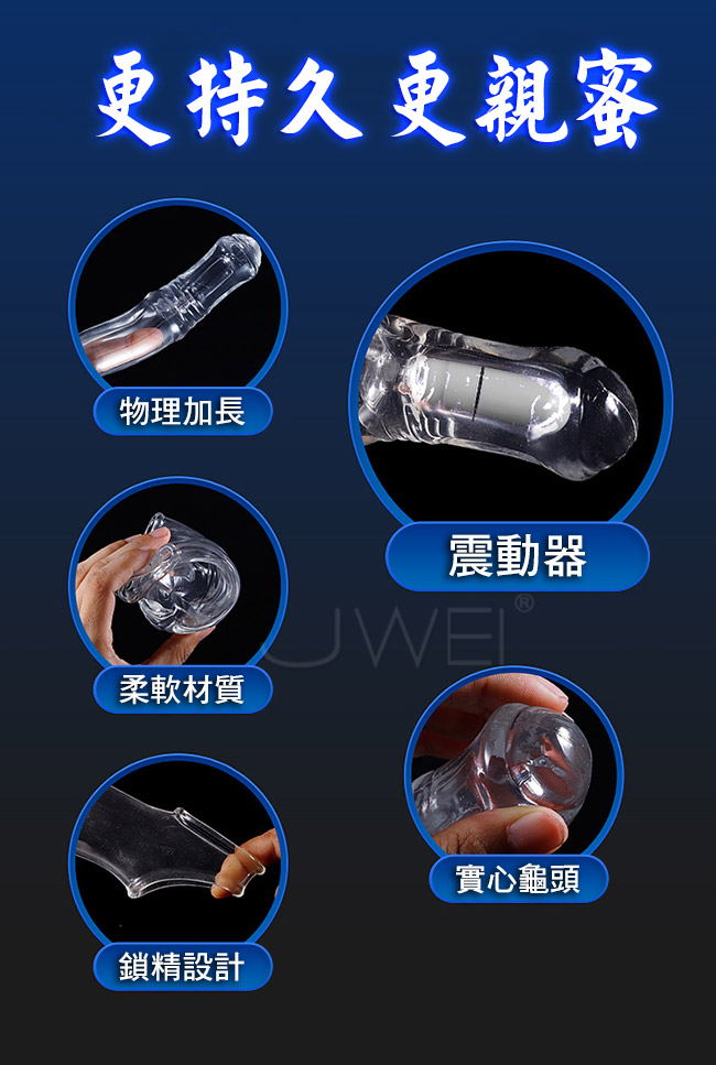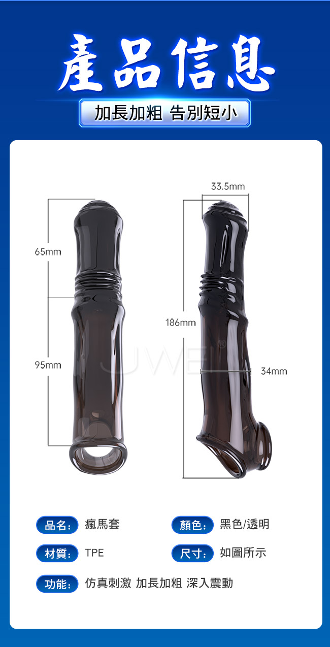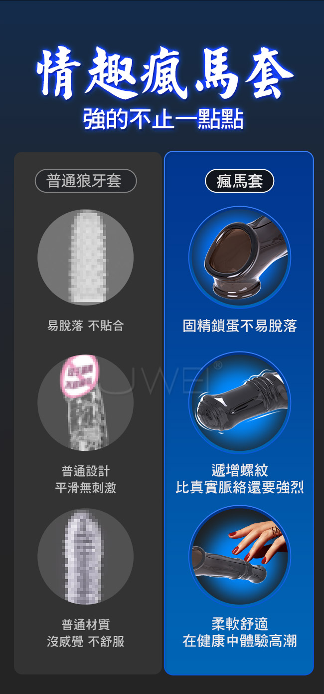 使用震動款瘋馬套,變身猛男,加長加粗,酥麻填滿整個通道,女友爽哭。實心龜頭,物理隔閡,降低敏感度物理加時,固精鎖蛋不易脫落;遞增螺紋,比真實脈絡還要強烈;柔軟舒適,在健康中體驗高潮;舒適不變形,隨意拉扯,強貼合度,鎖莖持久。