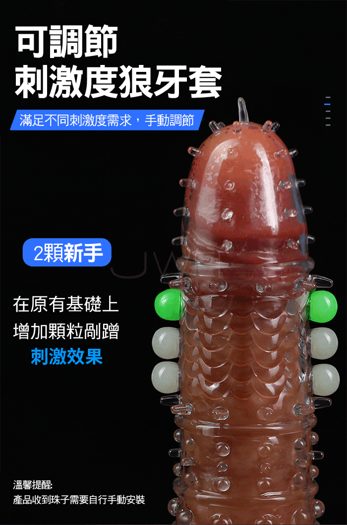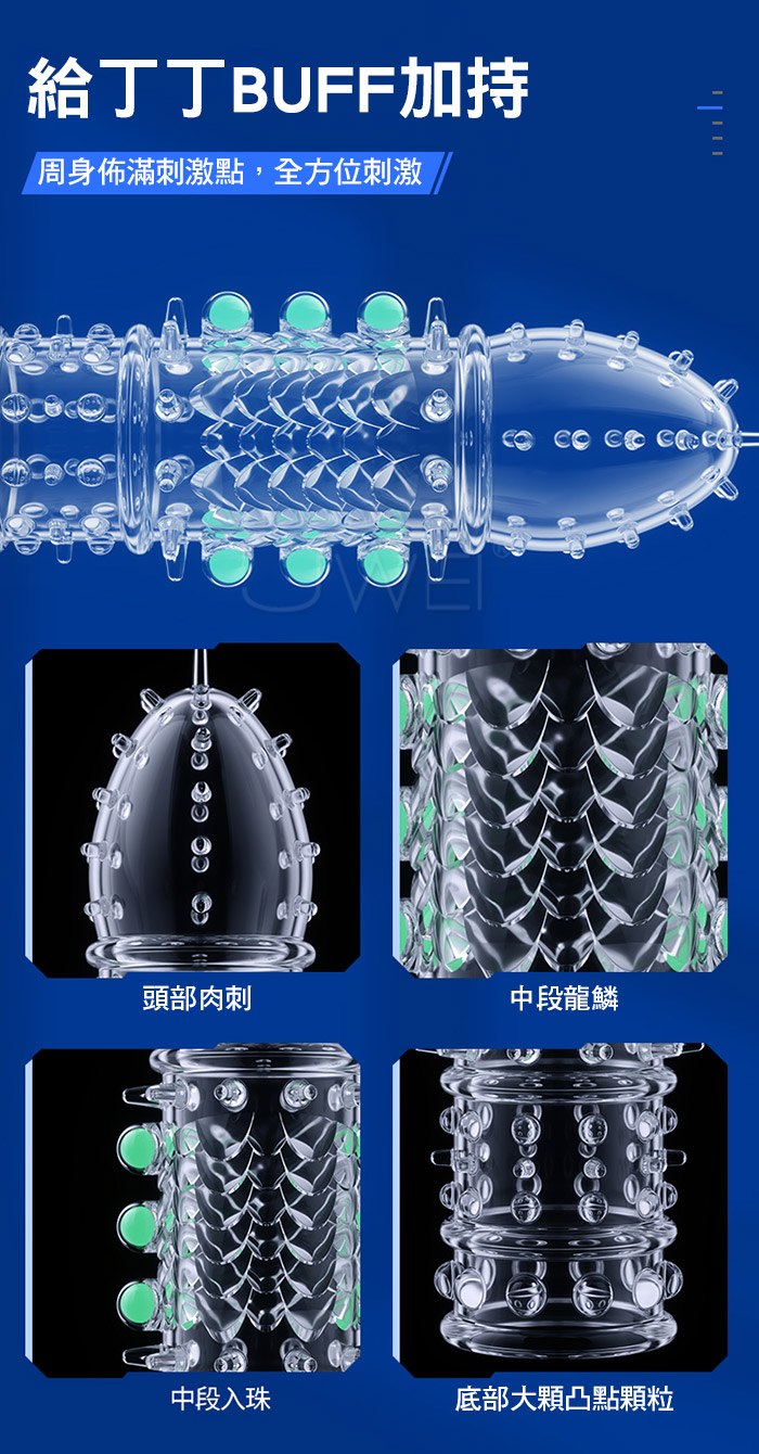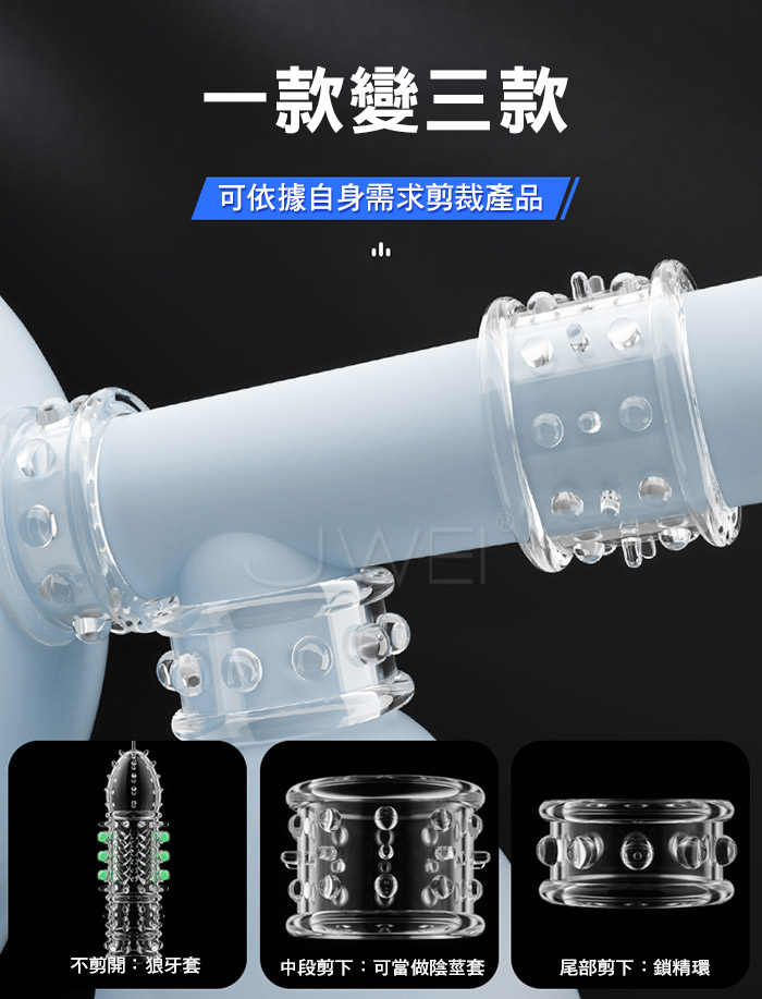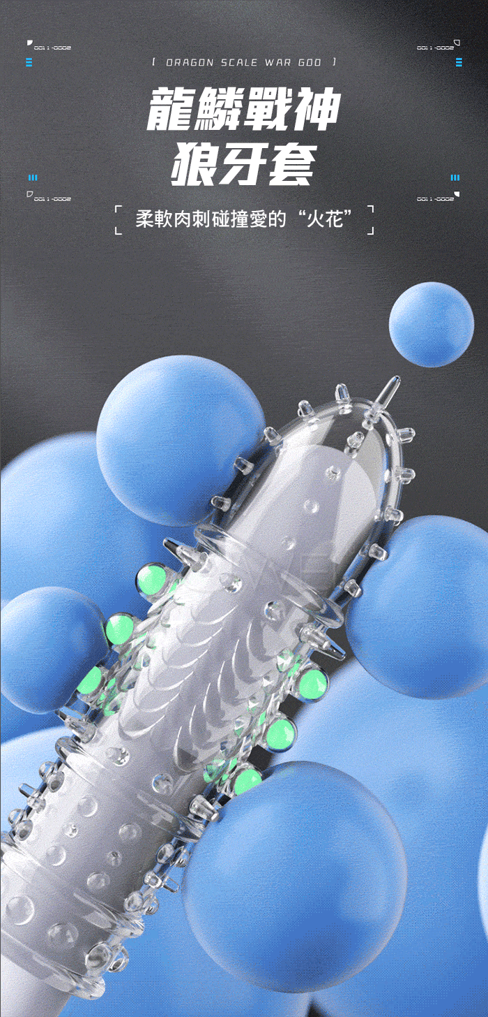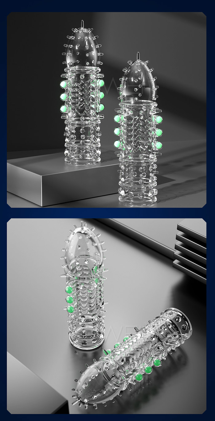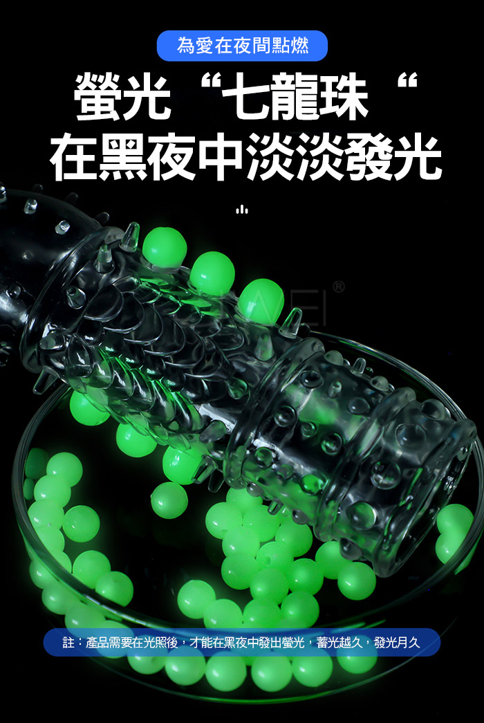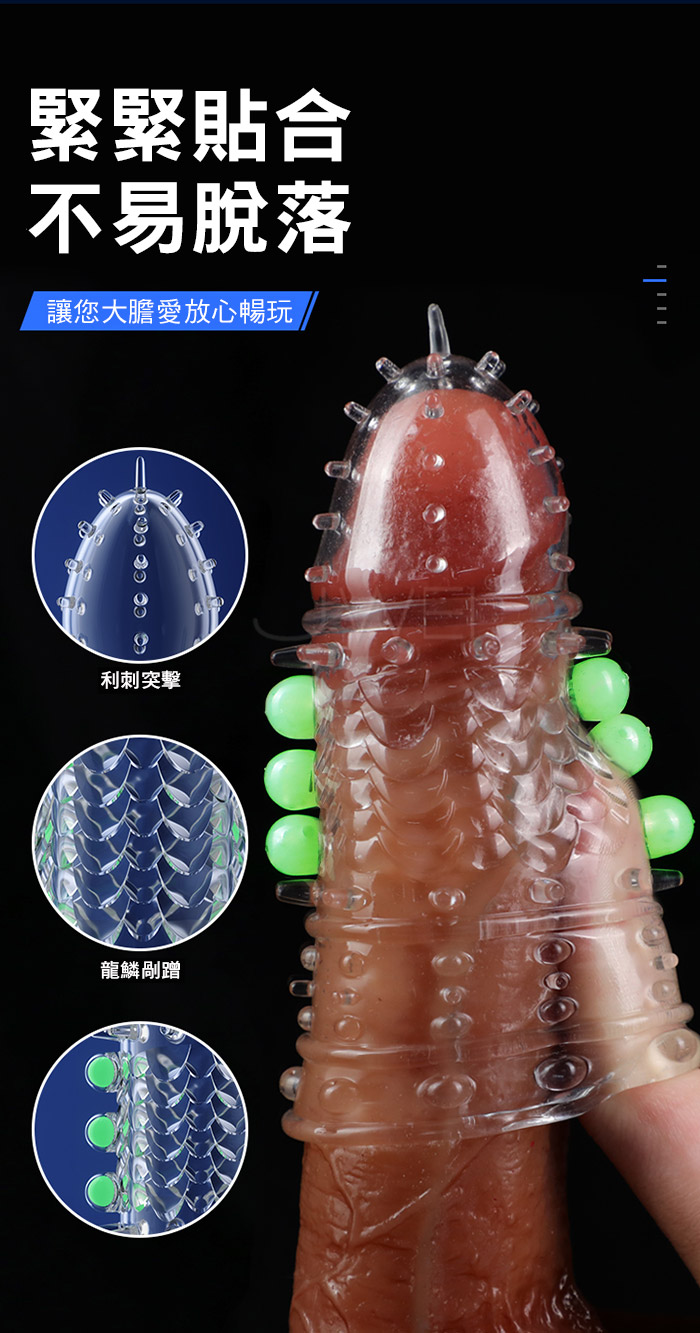 龍鱗戰神狼牙套在黑夜中淡淡發光,淡淡螢光,夜光燃愛,為愛在夜間 點燃,周身佈滿刺激點,頭部肉刺、中段龍鱗、中段入珠、底部大顆凸 點顆粒,全方位刺激;一款變三款,可依據自身需求剪裁產品;頭部加 厚設計,物理加時快感加倍;緊緊貼合不易脫落,讓您大膽愛放心暢玩 柔軟高彈不撐大,順滑的觸感更真實!