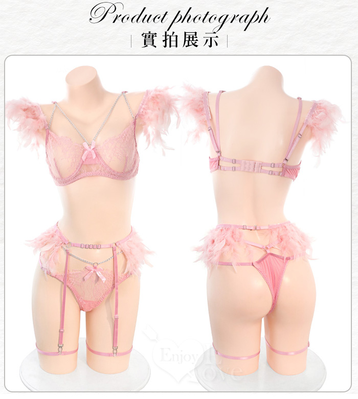 ►您現在的位置:首頁>情趣比基尼!蕾絲鋼圈輕柔羽毛銀鍊調情吊襪帶五件式套裝﹝黑﹞