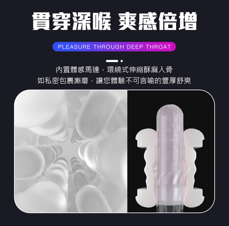 貫穿深喉,爽感倍增,內置體感馬達,環繞式伸縮酥麻入骨,如私密包裹廝磨,讓您體驗不可言喻的豐厚舒爽。