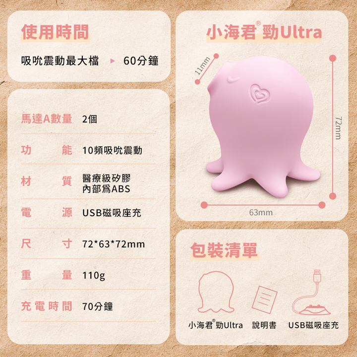 AyaGo SeaCune 小海君 勁Ultra 10頻快感吸吮按摩器 強力靜音可愛小章魚-USB磁吸式座充充電