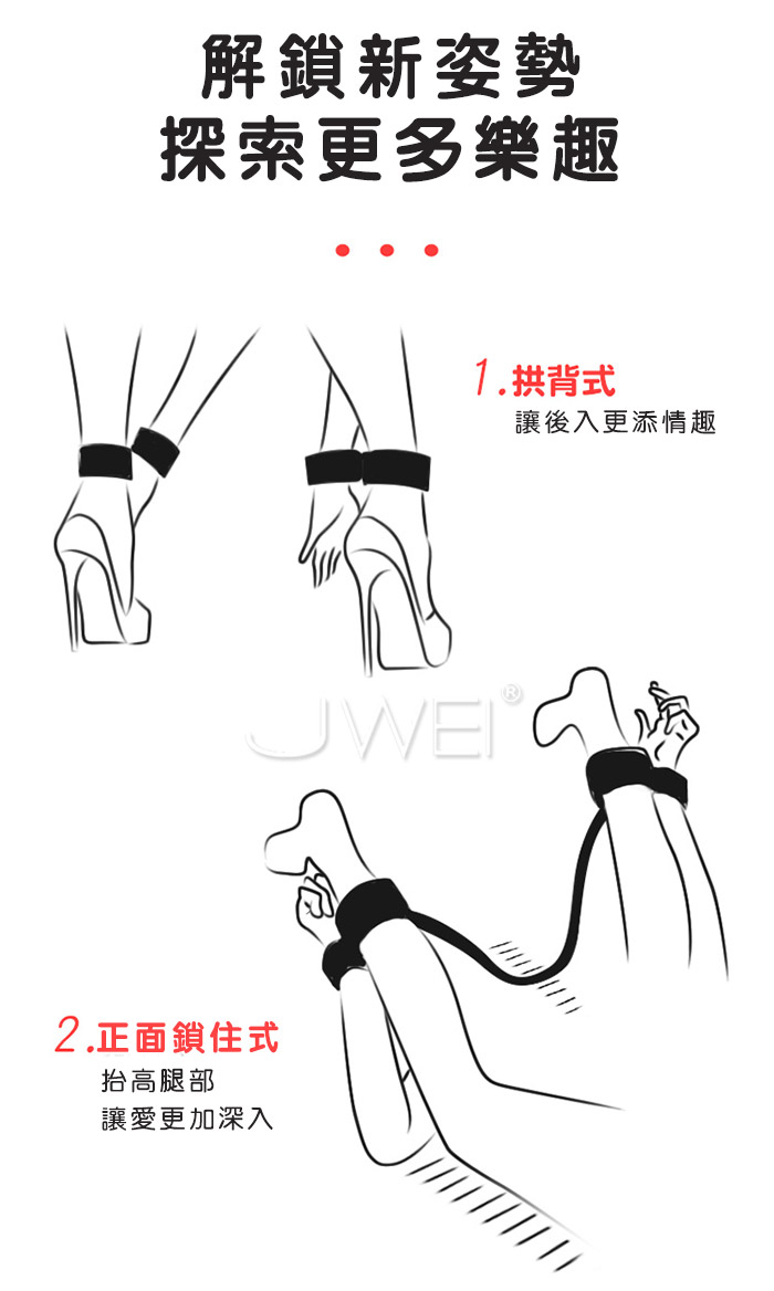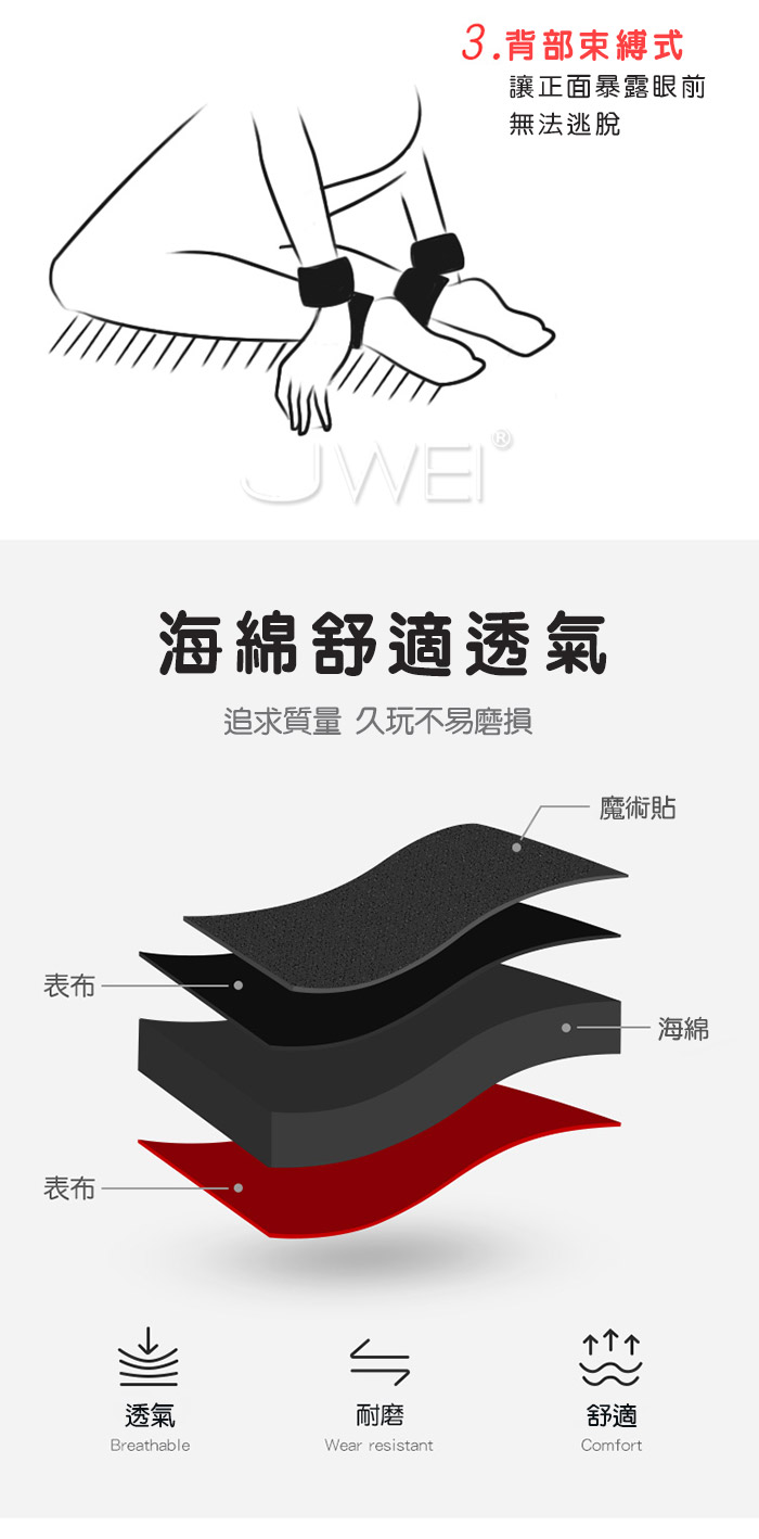 手腳束縛﹐分腿固定 解鎖新姿勢 探索更多樂趣! 優質尼龍綁帶 絲滑質感 貼合舒適 並且使用魔鬼氈設計﹐適合各種尺寸! 搭配使用皮鞭、眼罩、口球等 更添情調趣味 產品規格 ■材質:海綿 ■尺寸:大小詳如圖片標示 ■注意事項:SM道具請以安全、清醒、非強迫為使用原則, 使用前請先徵得對方 的同意;使用時如有任何不適,請立即停止使用。"