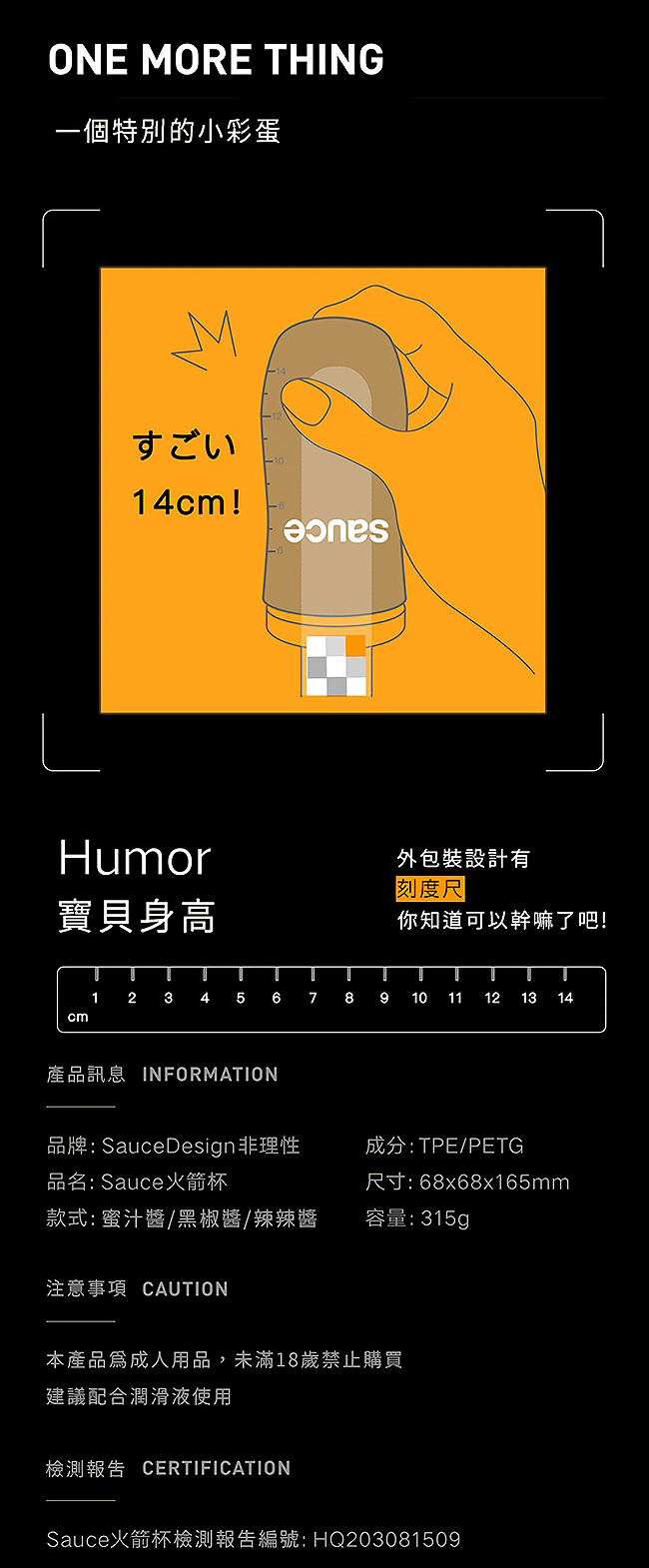 Sauce.黑椒醬消音火箭杯專為亞洲男性設計更加貼合寶貝尺寸,內部空間壓感親密自如。絕佳靜音氣阻設計讓您在使用中不再出現令人尷尬的“啾揪”聲。採用虛擬肌膚精緻技術醫療級TPE,安全柔彈易清洗可重覆使用唷~黑椒醬採S型四方擠壓通道,立體凸點小吸盤螺紋顛覆刺激。