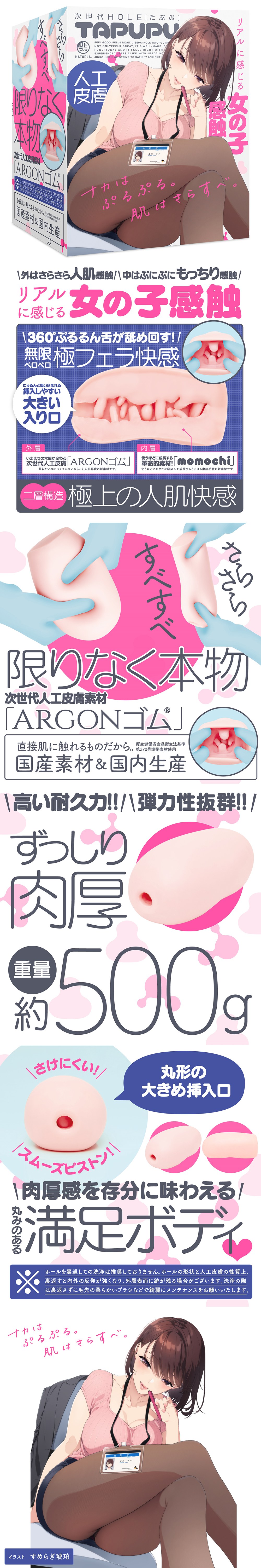 彷彿舔舐天堂一般360°纏繞著你舔!如同耳垂一般的柔軟溫柔中帶著刺激!外層使用超出常識般的次世代人工皮膚材質‘ARGON’。柔軟擔心不黏糊糊的仿造人體肌膚的新素材。內層採用的是越用越成長的創新素材『momochi』。使用的越多能更你更貼合的人體肌膚感的新素材。兩層構造實現了更好的人體肌膚觸感。直接接觸人體所以採用了國產材質&國內生產 MADE IN JAPAN。插畫家:すめらぎ琥珀