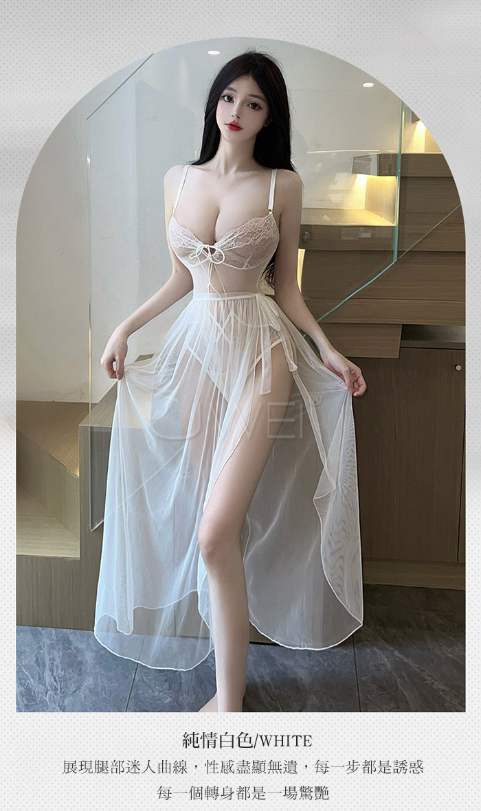 首頁>浪漫情網.性感深V露溝開襠免脫連身衣+飄逸紗裙-白色