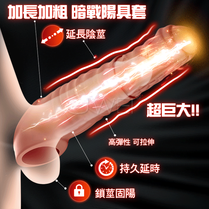 暗戰陽具套,超巨大!!超激長!! 戴上暗戰陽具套,讓你瞬間加長又加粗!! 雙層肉感,雙層刺激,加長8.5cm,頂到最深處~ 產品規格 ■尺寸:大小詳如圖片標示 ■材質: TPE ■功能: 加長加粗