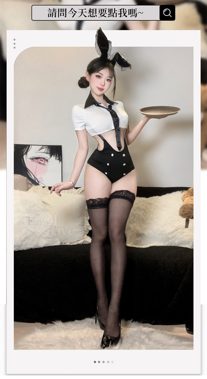 | 女僕角色扮演服!翻領可開釦黑白撞色短上衣鏤空雙肩吊帶褲四件式套装