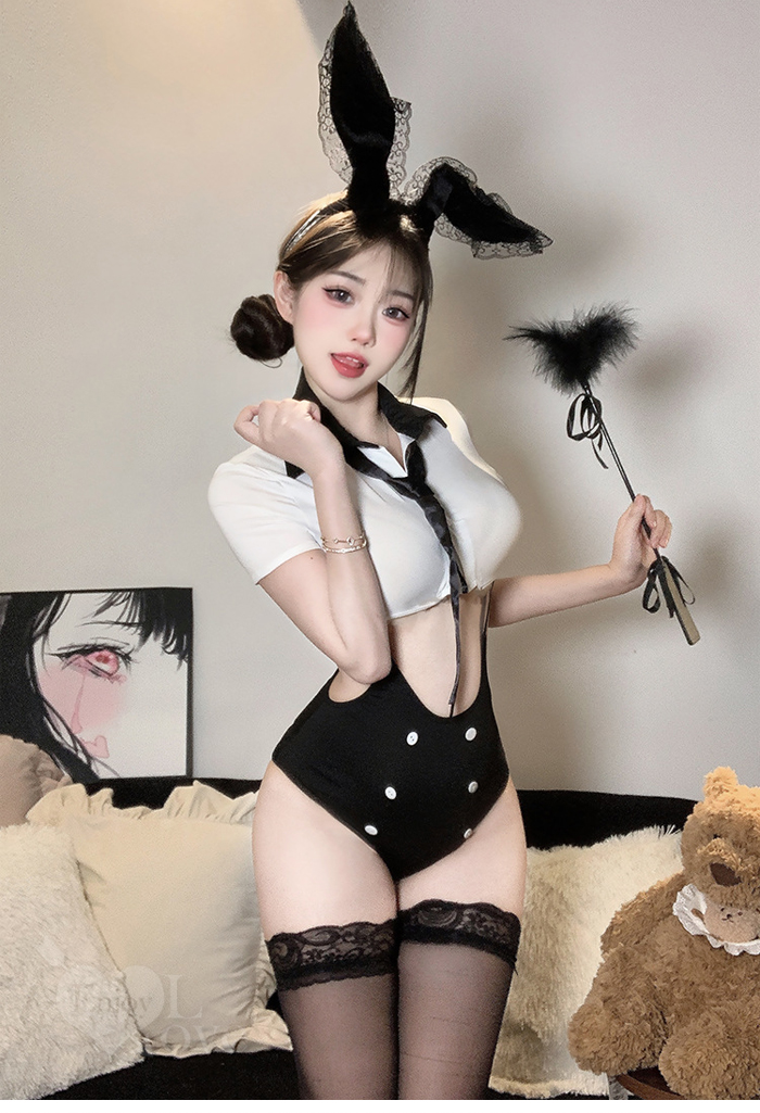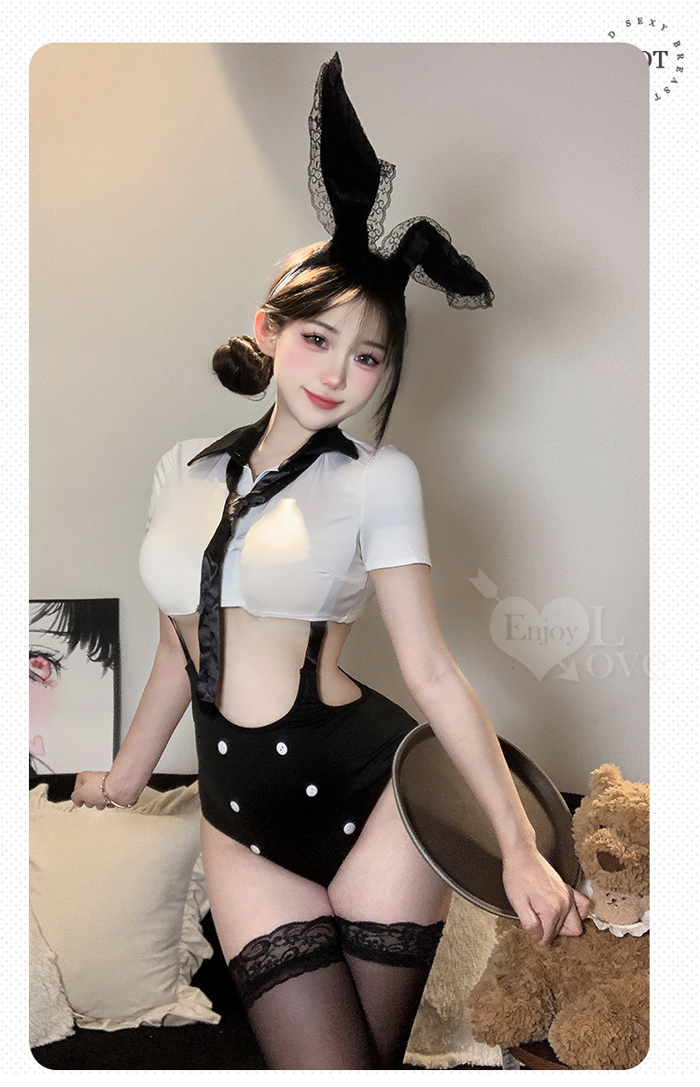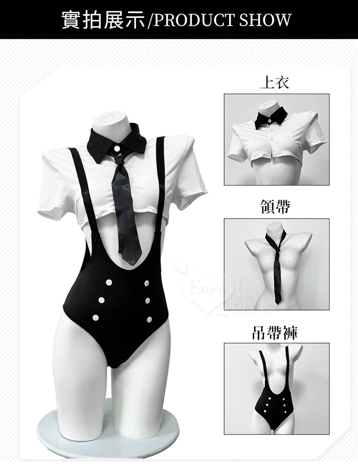►您現在的位置:首頁>女僕角色扮演服!翻領可開釦黑白撞色短上衣鏤空雙肩吊帶褲四件式套装