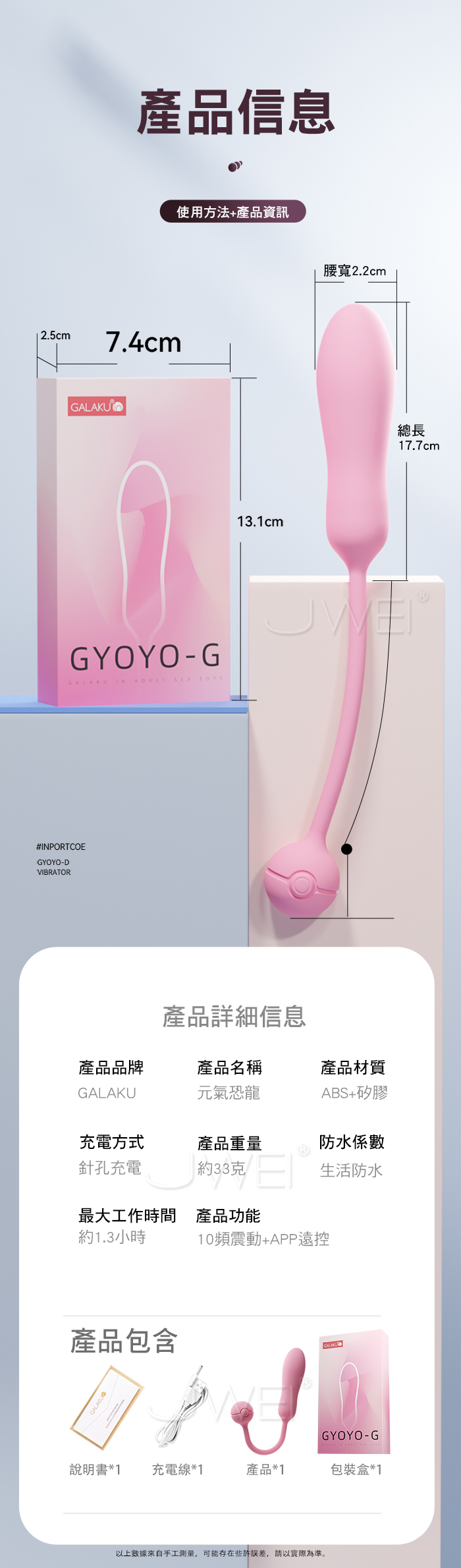 GALAKU 元氣系列~可愛設計,帶來愉悅的使用體驗,讓每次使用都充滿驚喜。 小蠻腰設計,自然入體,收縮緊緻,越用越緊,圓弧子彈頭設計入體不撐大。 產品規格 ■尺寸:大小詳如圖片標示 ■重量:如圖片標示 ■材質:TPE+AES ■功能:10頻震動、APP遠控