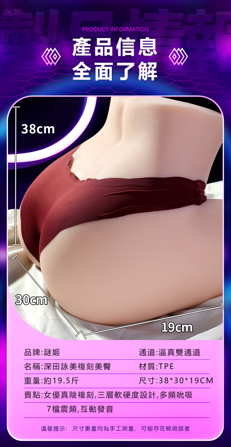 產品名稱:深田詠美の印象東京 規格:深田えいみ復刻美臀(電動工藝款) 材質:TPE 產品尺寸長*寬*高(cm):38*30*19CM 含包裝尺寸長*寬*高(cm):38.3*31.5*20.5CM 產品裸重(g):9.75KG 附包裝重量(g):10KG 單雙通道:雙通道 是否貫通:否 控制類型:按鍵