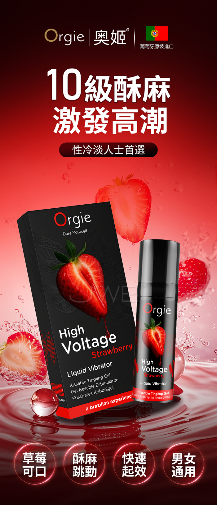 香甜草莓10級強效酥麻跳動凝膠 • 香甜的草莓味 可用於口愛 • 酥麻跳動指數:10級 • 適合情侶一起使用或者自己自嗨玩 • 適合人群:低敏感人群,中年+性冷淡 • 提高性喚起效果,增強高潮體驗 • 可搭配玩具一起使用 •女生塗抹黃豆粒大小在外陰,從陰蒂開始沿著順時針塗抹整個外陰唇; 男生塗抹1泵的量在陰莖上,從龜頭開始到整個陰莖,按摩吸收為止 (請根據自己的實際情況增加和減少用量) ■容量:15ml ■產地:葡萄牙