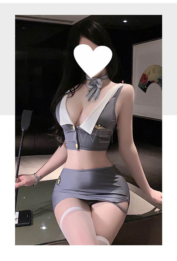 | 雲端蜜語.深V露溝裙襬鏤空包臀慾情空姐套裝【上衣+短裙+絲巾+T褲】