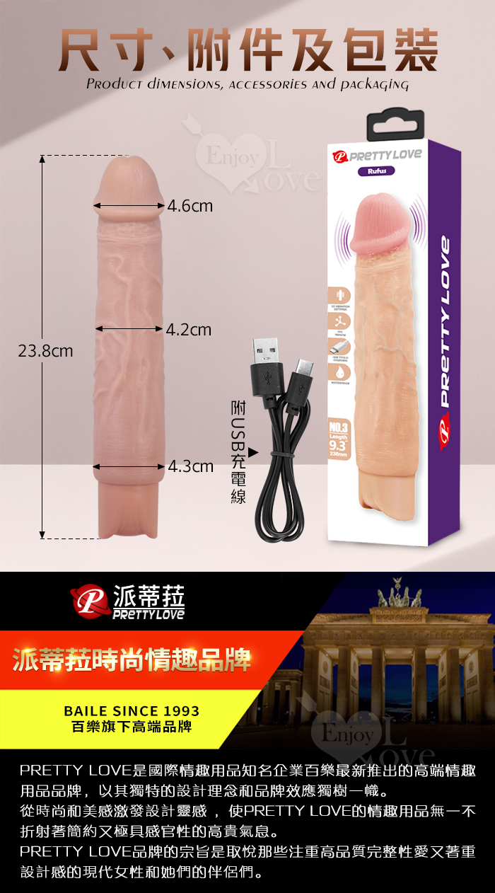 | 派蒂菈 ‧ Rufus 魯弗斯 10段變頻震動 膚色肌仿真筋絡大老二造型充電按摩棒 NO.3﹝9.3″ 23.8cm﹞